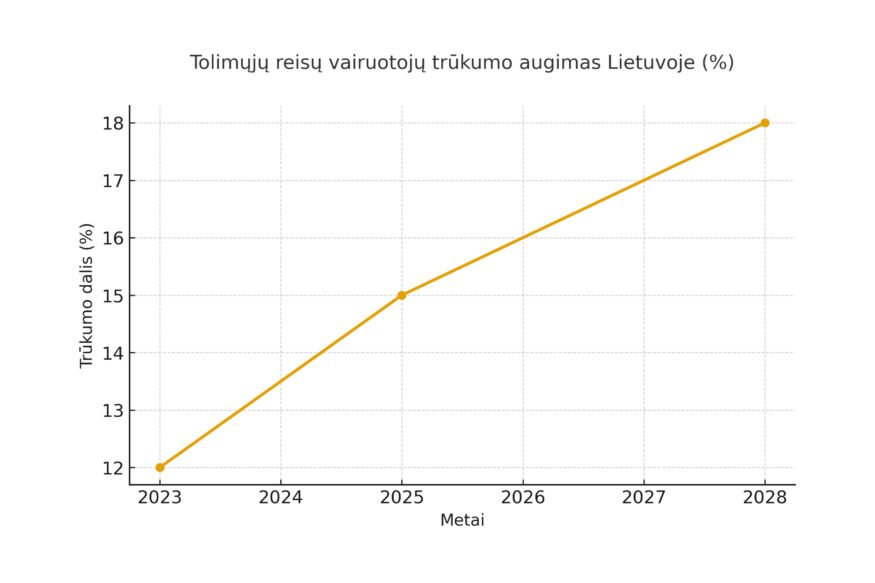 Lietuvoje deficitas matomas dar aiškiau. 2025 m. rugpjūčio–rugsėjo mėn. publikuotose analizėse nurodoma, kad šalyje trūksta apie 10–12 tūkst. profesionalių vairuotojų (apie 12% reikalingų darbo vietų), o jei politika nesikeis, iki 2028 m. trūkumas gali išaugti iki 18%. (Šaltinis: Trans.INFO )