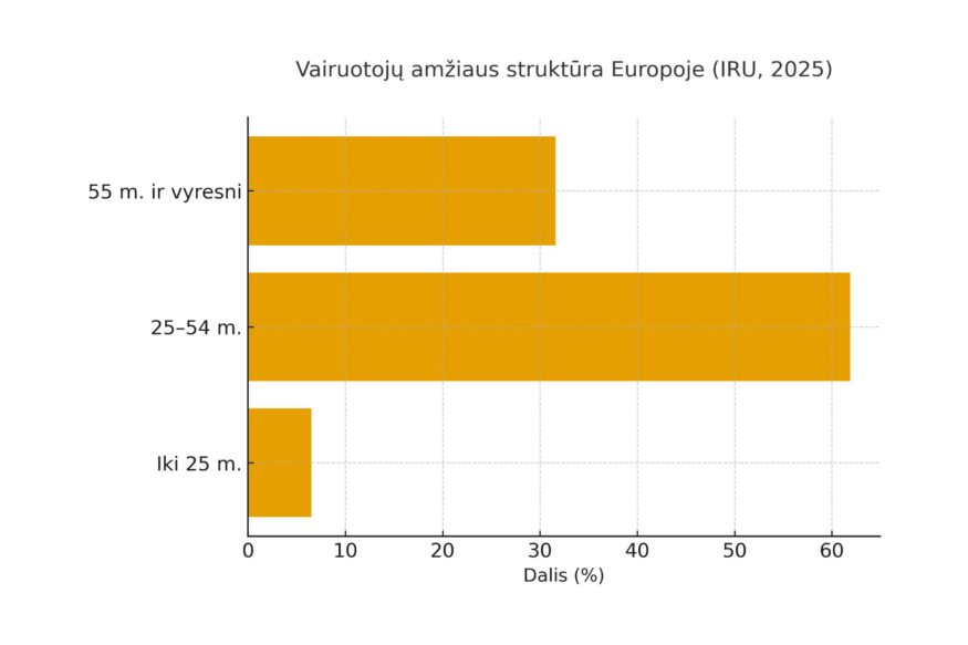 Tarptautinės kelių transporto sąjungos (IRU) paskelbtoje naujausioje ataskaitoje nurodoma, kad 36 tirtose šalyse 2024 m. pabaigoje liko neužpildyta apie 3,6 mln. sunkvežimių vairuotojų darbo vietų; ypač ryškus tapo amžiaus „žirklės“ efektas – vairuotojų iki 25 m. dalis tesiekia 6,5%, o vyresnių nei 55 m. – 31,6%. Artimiausiais penkeriais metais vien Europoje turėtų pasitraukti apie 17% šios profesijos atstovų. Tai struktūrinė, o ne ciklinė problema. (Šaltinis: IRU )